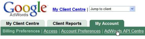 Then, click on your 'My Account' tab. Here, you will find a link to your new AdWords API Centre